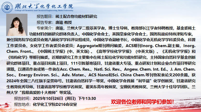 专家简介:唐瑜,兰州大学二级萃英学者,博士生导师。教育部长江学者特聘教授,基金委稀土功能材料创新研究群体负责人,中国化学会会士,英国皇家化学会会士,国务院政府特殊津贴专家。兼任国务院学位委员会第八届化学学科评议组成员,中国化学会副秘书长,中国化学会无机化学学科委员会、科普工作委员会、女化学工作者委员会委员;Aggregate期刊顾问编委,ACS期刊Inorg. Chem.副主编,Inorg. Chem. Front.、《中国稀土学报》(中、英文版) 、《高等公司化学学报》(中英文版)、《无机化学学报》和《结构化学》等期刊编委。近期的研究工作主要集中在稀土配位化学和功能材料研究,主持国家自然科学基金创新研究群体项目、重点项目和面上项目,111引智基地项目,甘肃省重大专项、重点研发计划和企业合作项目等研究课题。以通讯作者或第一作者在Acc. Chem. Res.、Natl. Sci. Rev.、Angew. Chem. Int. Ed.、J. Am. Chem. Soc.、Energy Environ. Sci.、Adv. Mater.、ACS Nano和Sci. China Chem.等刊物发表论文200余篇。获2024年全国三八红旗手荣誉称号、甘肃省自然科学一等奖、中国化学会首届“利华益”化学创新奖、甘肃省研究生教育优秀导师、甘肃省高等公司教学名师奖、霍英东青年教师奖、宝钢优秀教师奖、兰州大学十佳导学团队、兰州大学“我最喜爱的十大教师”等奖项。