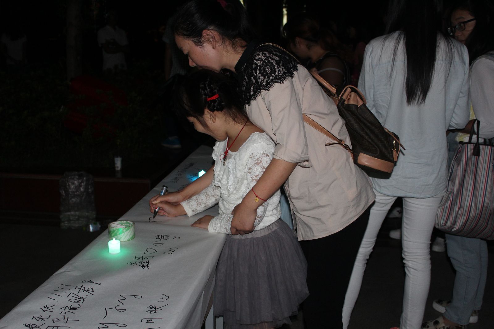 趴在长卷上写字画画的五个小女孩吸引了很多人的目光,她们在长卷上画着嫦娥仙子、动物和一些卡通人物。八岁的张千梓在上面写着“祝所有人节日快乐。”李琪瑶则写下了:“愿望,当演员!!!”张千梓的妈妈感慨道:“平常她们只知道过节,却不知道什么是传统节日传统习俗,今天专门带孩子来感受一下。”